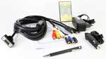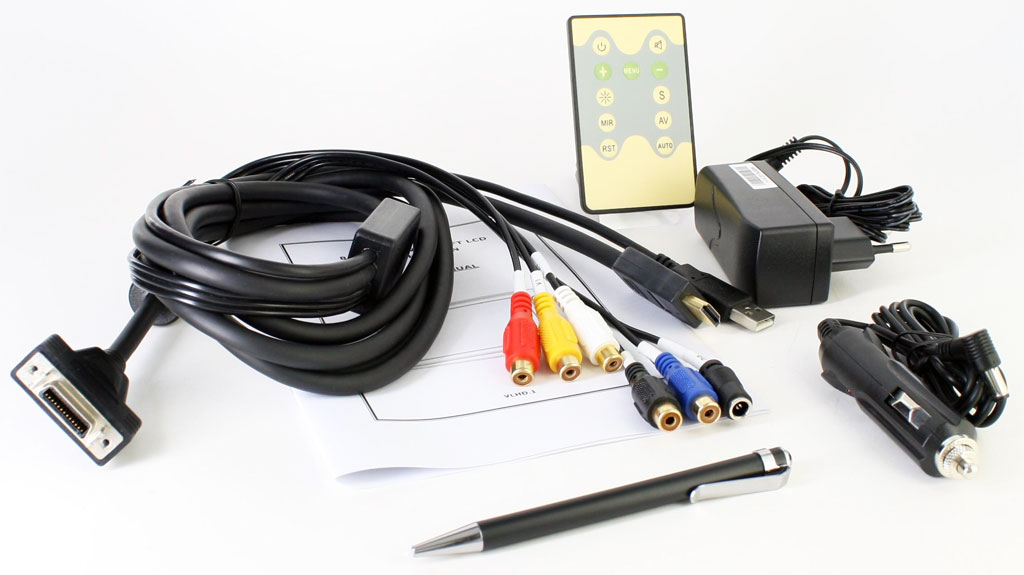 The device has integrated Stereo-speakers and an automatically switched rear camera input. An AC-Home adapter and a cigarette lighter adapter is included with the package, as well as an IR-remote control unit and the extralong (2,5 meters) All-In-One connector cable.